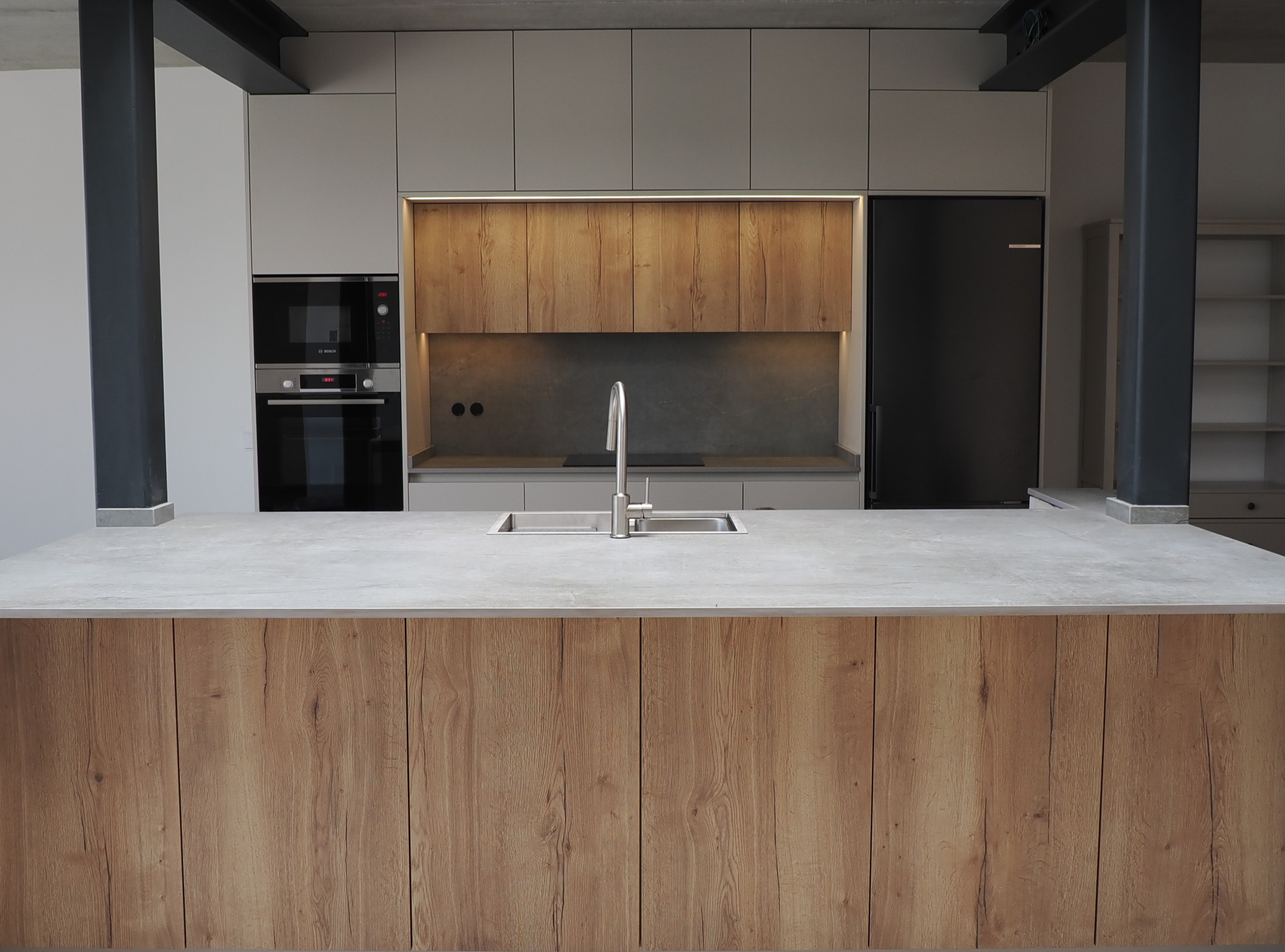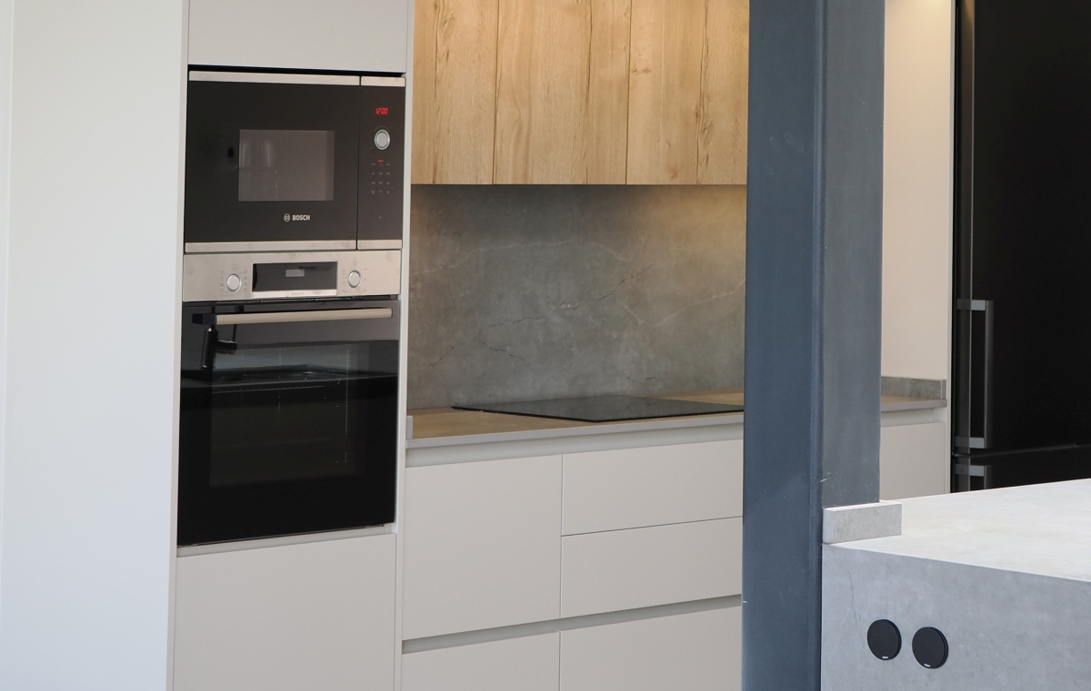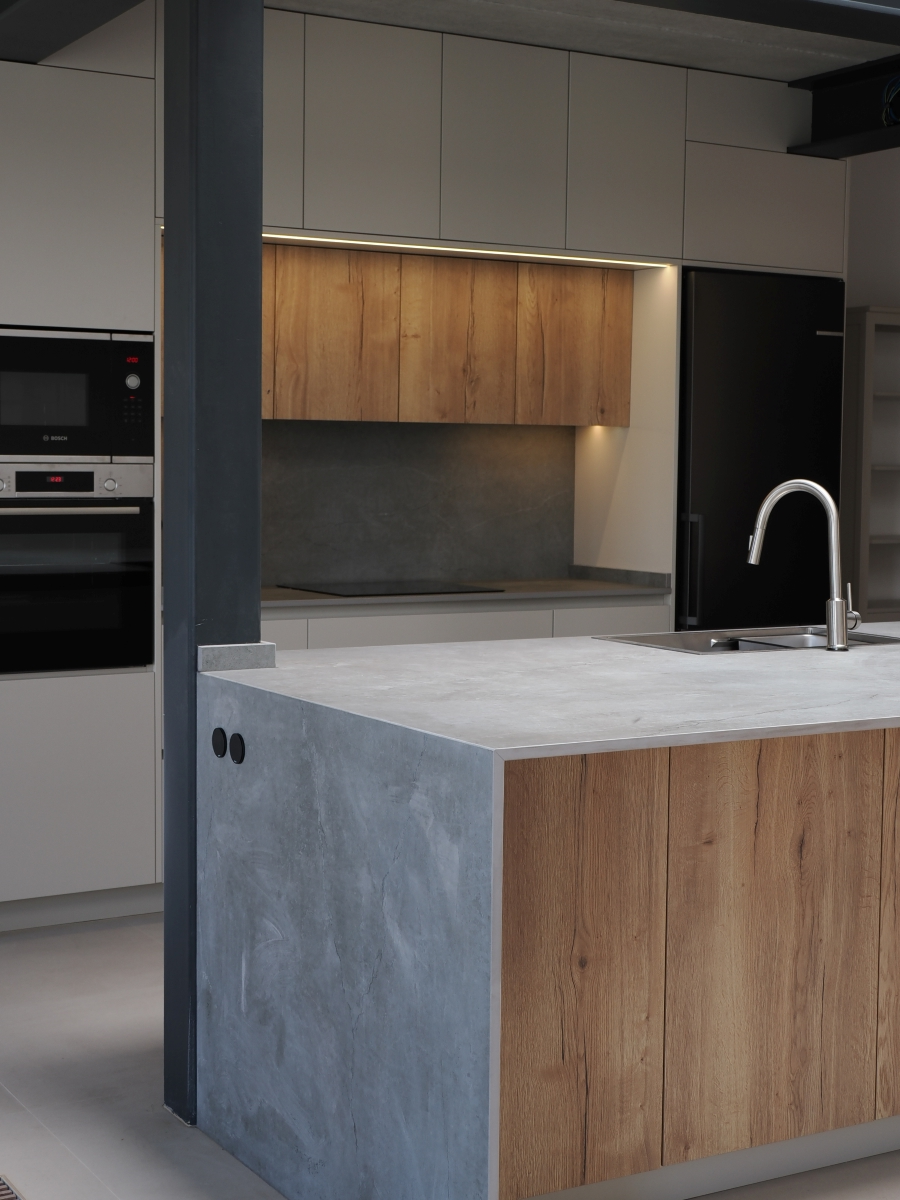 Esta cocina de grandes dimensiones ha sido diseñada a medida para una vivienda con carácter en el centro de Mallorca, combinando a la perfección el estilo industrial con toques rústicos. Integrada en un espacio tipo loft, la cocina respeta y realza la estructura original del inmueble, destacando las vigas metálicas vistas que aportan un aire robusto y contemporáneo.
