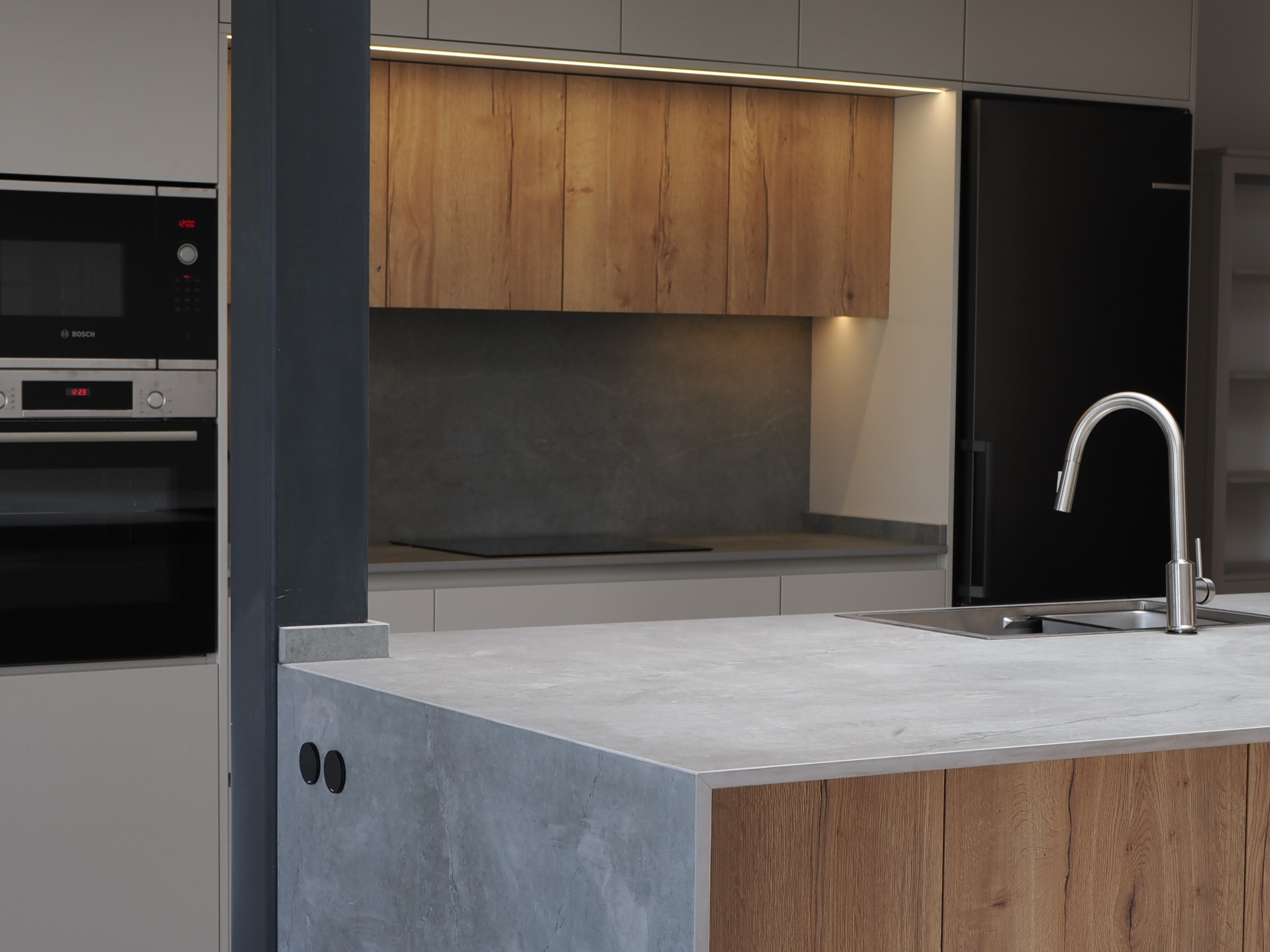 El mobiliario combina dos acabados que contrastan y se complementan: Gris Angora y Roble Halifax, ambos en material tecnológico de alta resistencia, pensado para durar y mantener su belleza con el uso cotidiano. En el interior, los cajones Legrabox en antracita y los cascos en Gris Ratón refuerzan el diseño elegante y sobrio del conjunto. La iluminación LED cálida aporta un ambiente acogedor, ideal tanto para cocinar como para compartir momentos.